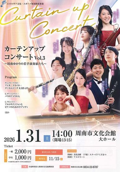 周南市出身の若手演奏家8人が出演するカーテンアップコンサートⅤOl.3が1月31日(土)午後2時から周南市文化会館大ホールで開かれる。 市文化振興財団の主催...