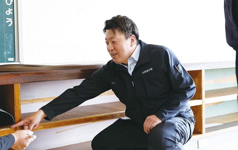 教員に施工法を教える古野会長マーク付き 周南市の今宿小(前川孝校長)のPTA会長で防長建材㈱取締役社長の古野陽一郎さんを中心とした山口県室内装飾事業協同組合青...