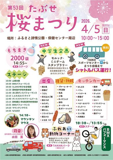 田布施町桜まつりが5日(日)、田布施町のふるさと詩情公園と保健センター周辺で開かれる。午前10時から午後3時まで。主催は田布施町観光協会。 会場周辺には約3...