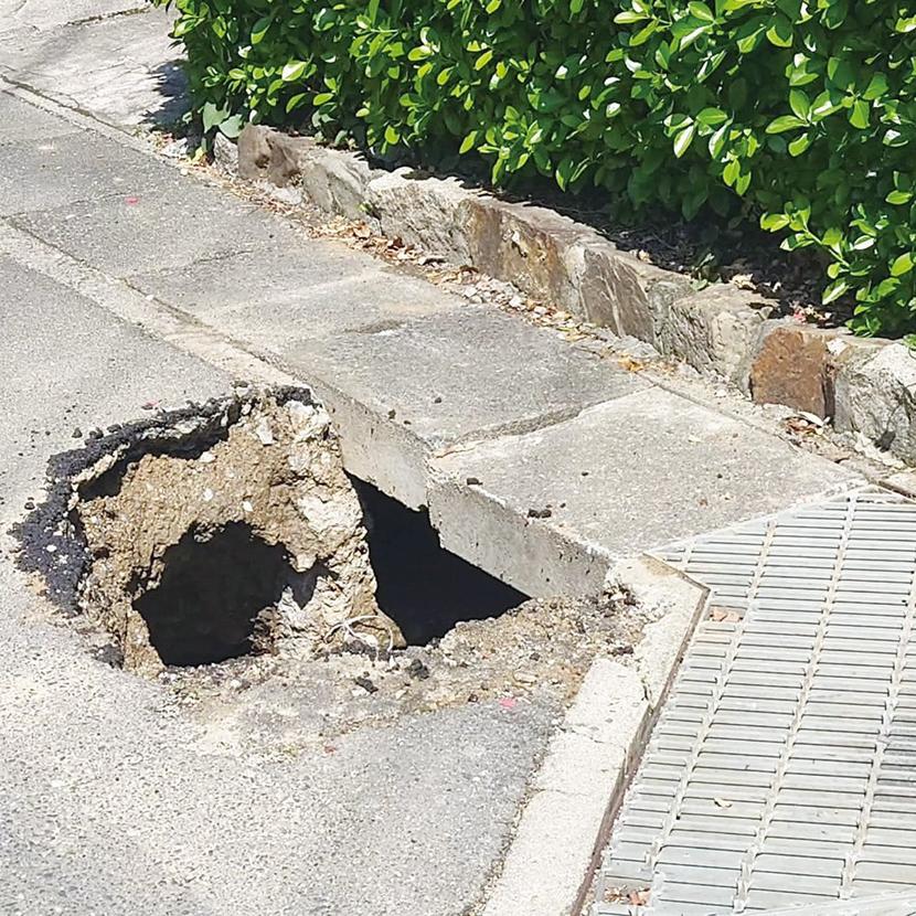 地域周南市周南市栗屋の市道西浦線で5日、電信柱の近くの道路に空いた穴が見つかった。
