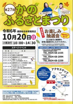 周南市鹿野の鹿野総合体育館周辺で20日(日)午前10時から午後2時半まで第27回かのふるさとまつりが開かれる。 かのふるさとまつり実行委員会の主催。鹿野町商...