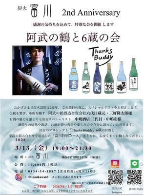 【周南】「炭火 富川」2周年に 3月13日・「阿武の鶴と6蔵の会」