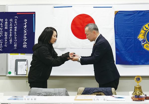 周南市の会社員の原田陽子さんがヘアドネーションに協力したことをたたえ、12日に開かれた新南陽若山ライオンズクラブ(LC=大内一也会長)の例会の席上、大内会長か...