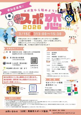 周南市スポーツ協会は3月15日(日)午後1時から3時30分まで、20〜30代の独身男女を対象にしたスポーツによるマッチングイベント『スポ友で出会う!春のマッチ...