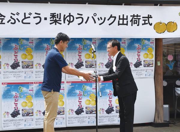 【周南】須金のブドウ、ナシを全国へ ゆうパック出荷式
