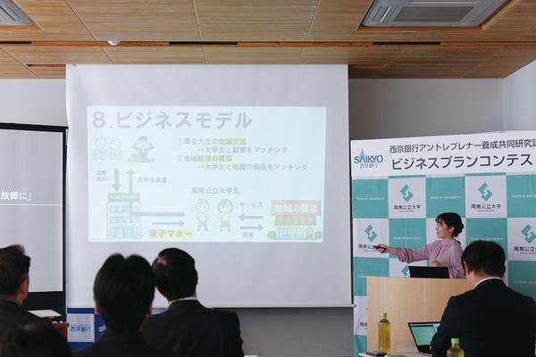 周南市の周南公立大(髙田隆学長)と㈱西京銀行(松岡健頭取)の起業促進プログラム「アントレプレナー共同研究講座」を受講した学生によるビジネスプランコンテストが2...