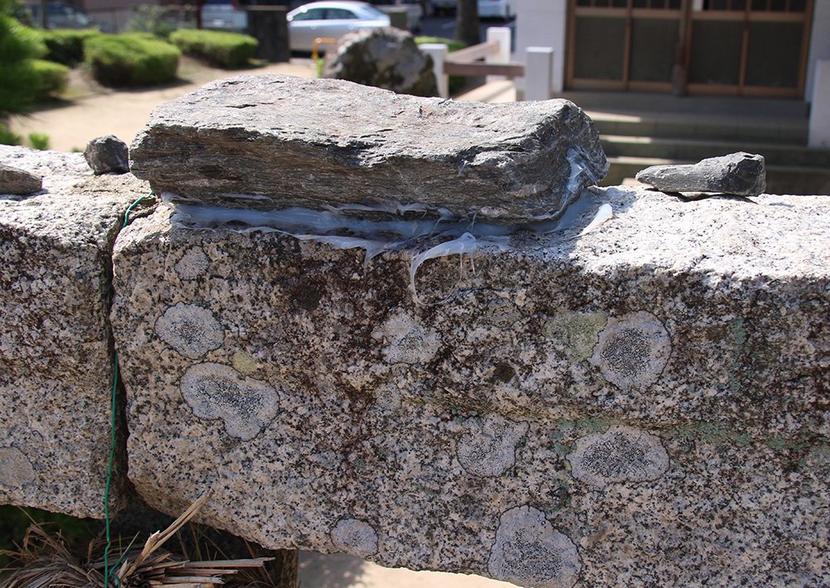 下松発祥の地と伝えられる下松市北斗町の金輪神社(神足正己宮司)の鳥居の上に、何者かが大きな石を接着剤で固定しているのが12日、住民に発見され「こんなことはしな...