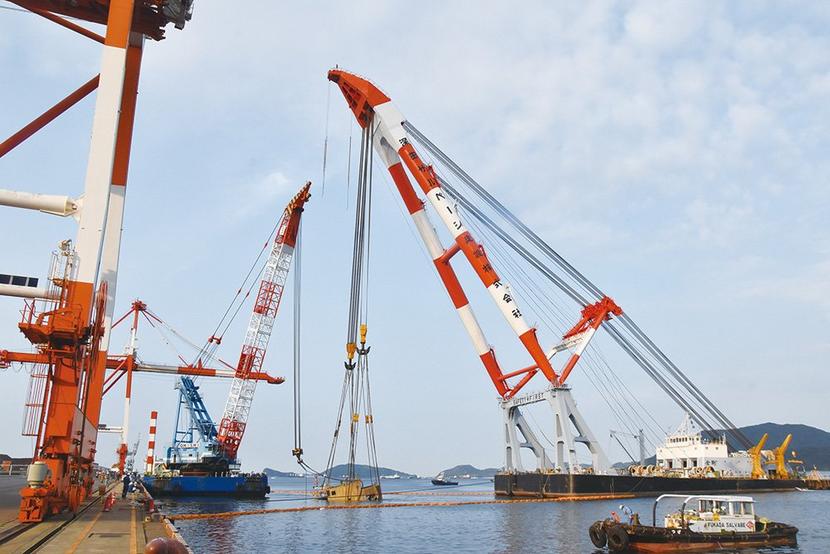 船体を海上に見せたコンテナ船 7月31日に山口県周南市の徳山下松港の晴海ふ頭のコンテナターミナルで荷崩れを起こして転覆したコンテナ船の引き揚げ作業が29...