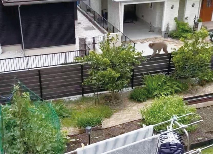 住宅敷地内を歩くサル(読者提供=24日撮影)