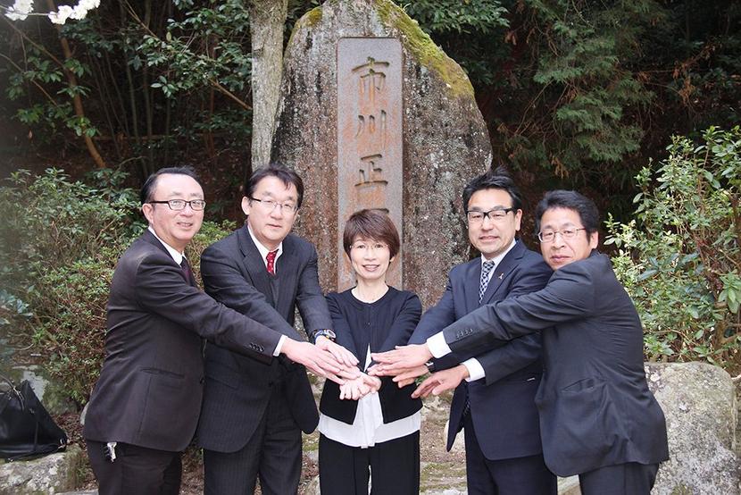 碑の前の五島、松田さんら