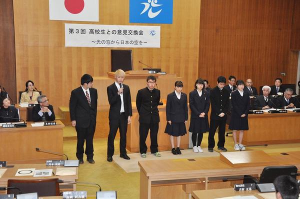 光市議会(木村信秀議長、17人)は“第3回高校生との意見交換会〜光の窓から日本の空を”を10日午後1時半から市役所3階の市議会本会議場で開き、3校の21人と公...