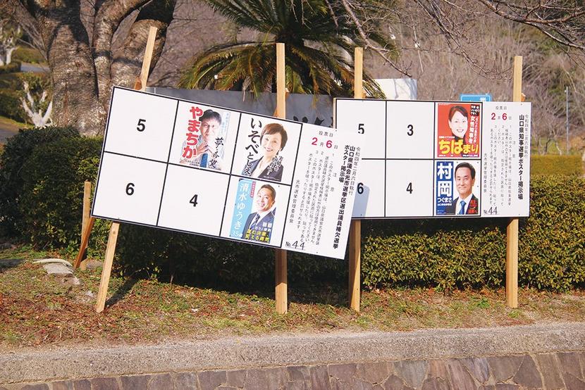 山口県光市光井の市総合体育館前に市選管(門出肇委員長)が設置した6日(日)投開票の県議選光市区補選(欠員1)の公営ポスター掲示板が1日、強風にあおられて傾き、...