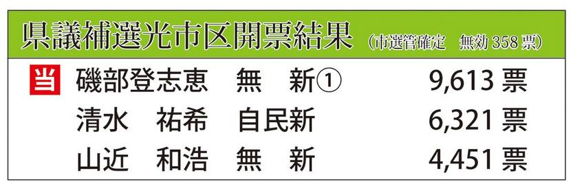 政治光市山口県議選光市選挙区補選は県知事選と同じ6日に投開票され、無所属新人で元市議会副議長の磯部登志恵さん(62)=室積松原=が当選した。自由民主党公認の新人で前市議の清水祐希さん(35)=島田=と、無所属新人で元連合山口事務局長の山近和浩さん(57)=岩狩=は及ばなかった。磯部氏は合併前を含めて光市で初の女性県議となる。