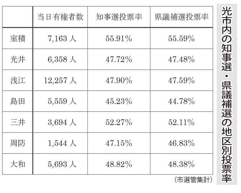 投票率が磯部氏の地元の室積地区で55.59%と市内7地区でトップだったのも目を引いた。これも市長選で惜敗した磯部氏が同情票を上積みした側面として注目される。
