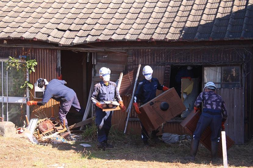 家屋から物品を搬出する作業員