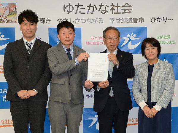 山口県光市の光市議会の会派や政党支部から、市の来年度の予算編成に反映させてほしいと「行政要望書」の提出が今年も相次いでいる。 5日にこう志会(萬谷竹彦代表、...