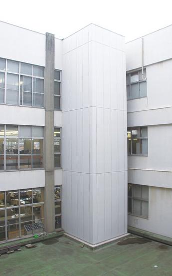 エレベーターは地下1階から3階までで、建物からせり出すように外付けに取り付けられている。