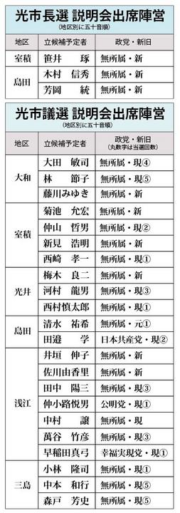 【山口県】[光市長選][光市議選]無投票から一転、4超の混戦に 立候補予定者説明会・市長3陣営、市議22陣営