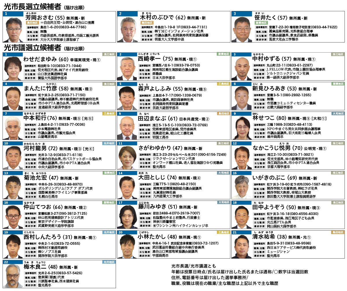 政治光市光市の市長選と市議選(定数18)が20日に告示され、市長選に新人3人▽市議選に現職15人、元職1人、新人6人の計22人が立候補した。投票日は衆院選と同じ27日(日)。