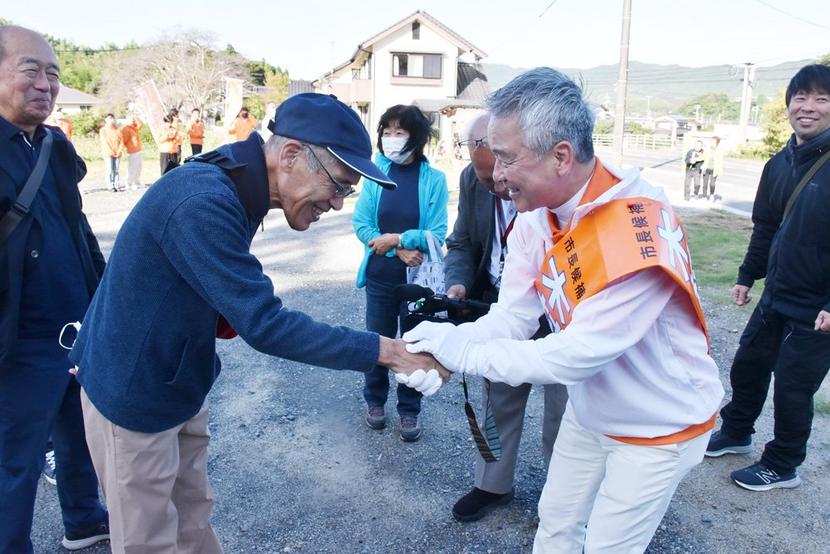木村陣営は中島田の事務所近くの広場で出発式を開き、オレンジ色のたすきをかけた木村候補が約50人の支持者を前に「光市が変化を起こす時がきた」と訴えて遊説に出発した。