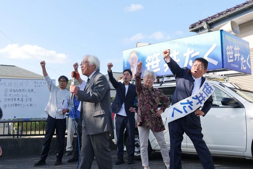 笹井候補の出陣式は室積の山根町自治会館駐車場で開かれ、上関町の清水康博町議、周南市の吉安新太市議も駆けつけ、地域住民100人が参加した。