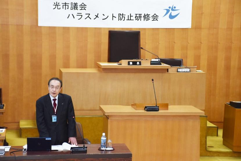 光市議会ハラスメント防止研修会が17日、本会議場で、全議員18人が出席して開かれ、東京の㈱ビーコンラーニングサービスフェローの森口敬司さんがハラスメントとは何...
