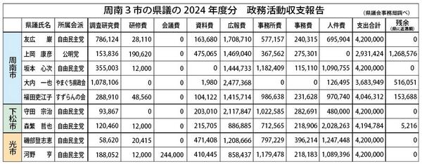 村岡嗣政県知事と県議の所得や資産、県議に年420万円が交付される政務活動費の2024年度分の収支報告書が30日、条例に基づいて公開された。政務活動費では、周南...