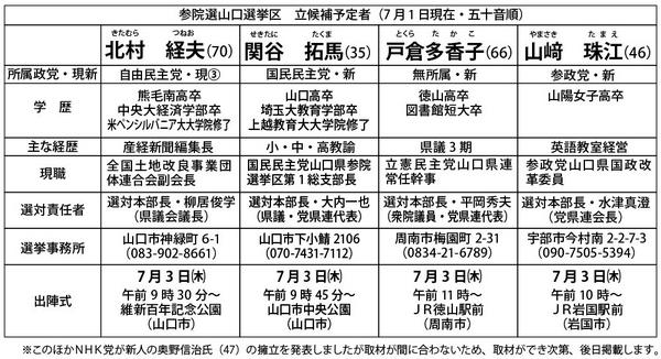 参院選が3日に公示される。山口選挙区は自由民主党▽国民民主党▽参政党▽無所属の4人のほかNHK党も新人の擁立を発表し、改選の1議席を5候補で争う公算になった。...