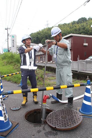 下松市末武中と周南市久米の市境にある両市上水道の“久米坂本相互連絡管”で2日、災害時に備えた相互応援給水訓練が開かれ、両市の上下水道局の職員が相互に操作して正...
