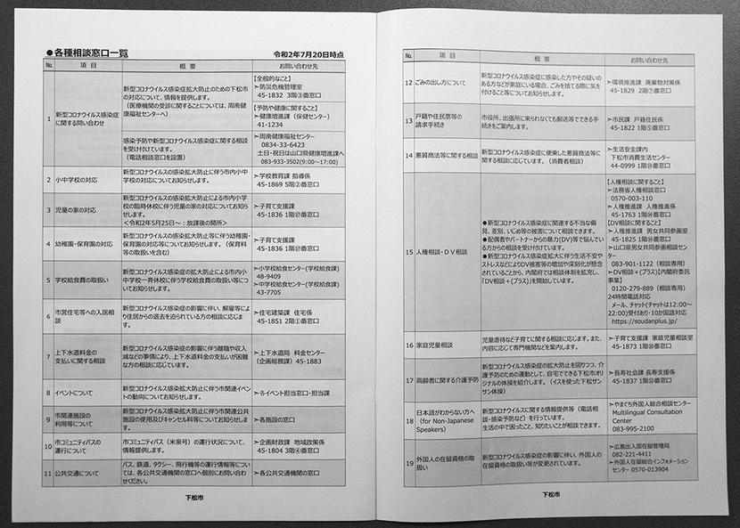 回覧板用の説明書はA4判8ページ。基本的な予防策のほか、26種類もの給付金や支援策、経済対策▽21項目の内容に沿った相談窓口を紹介している。