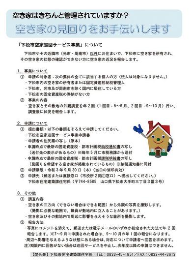 この取り組みは周南3市以外に住む、下松市内の空き家所有者が対象。市職員が5〜6月と9〜10月の年2回、所有者が指定する空き家を訪問して外観などを撮影し、報告書と写真を郵送か電子メールで所有者に送って報告している。