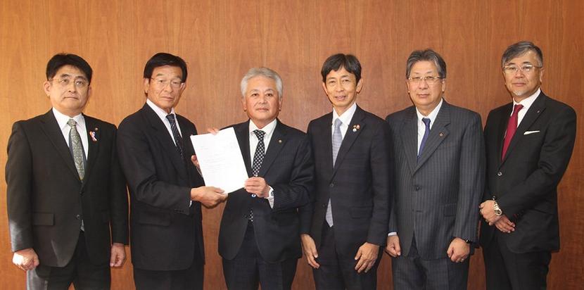 左から山田、加茂、九内各副会頭、弘中会頭、国井市長、玉井副市長、鬼武部長