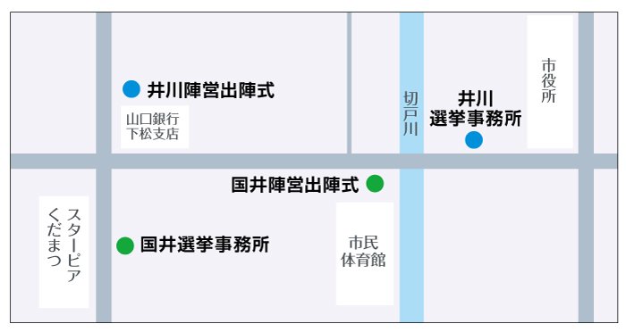 当初は準備の早さで優勢と見られた井川氏を、自由民主党と連合山口が推薦する国井氏が激しく追い上げてきた。3月31日にスターピアくだまつ大ホールで開いた国井陣営の総決起大会は約1,100人で勢いを見せたが、井川陣営は集会を報道機関に公開していないため、陣営の熱気はわからないままだ。