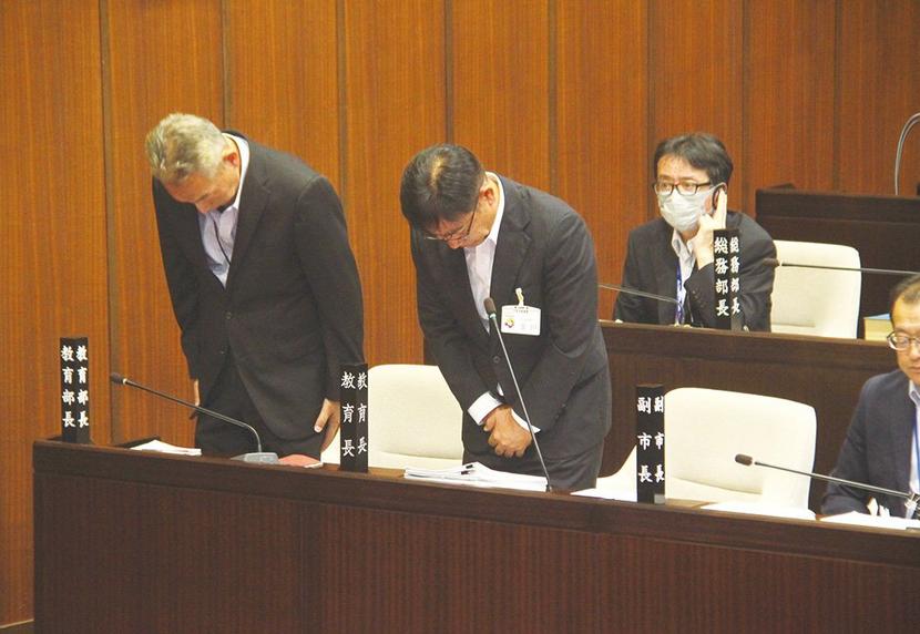 頭を下げる原田教育部長(左)と玉川教育長