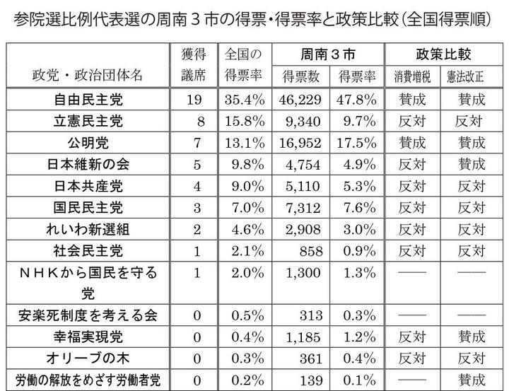 参院選の投開票から20日。与党勝利、野党苦戦、新党躍進の裏側で「消費増税」や「憲法改正」に限ると周南地域の民意はどう示されたのか。3市の比例代表選の結果から分析した。 (山上達也)