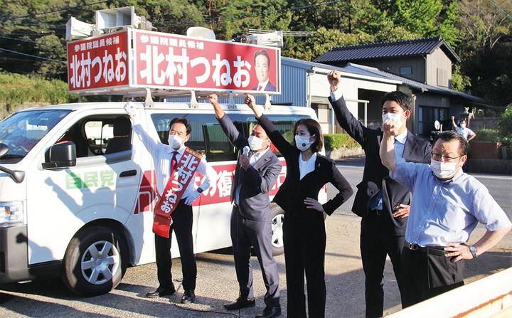参院補選が告示された7日、光市総合体育館前で支持者約400人が集まって開かれた同党の北村経夫候補の光地区出発式でも信千世氏が父親に代わってあいさつし、前防衛大臣政務官の松川るい参院議員、河野亨県議も支持を強調。来年2月の県議補選に同党公認で出る清水祐希市議(35)がガンバロー三唱の音頭を取った。