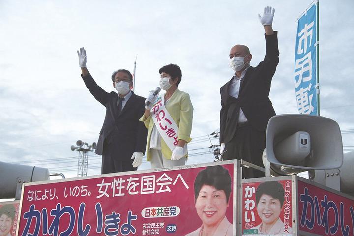 日本共産党新人の松田一志氏(64)は参院補選の同党新人、河合喜代候補(61)と表裏一体の活動を展開している。11日には光市浅江のマルキュウ光店前で河合候補が開いた街頭演説に参加し、地元の同党の田辺学市議と車上で共にマイクを握って支持を訴えた。