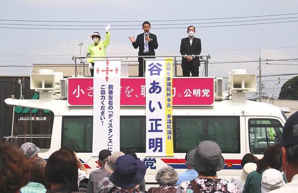 公明党の街頭演説会が18日、山口県周南市、下松市、光市の計5カ所で開かれ、支持者計約950人が同党の谷合正明参院議員(49)の話を聞いた。谷合議員は22日(水...