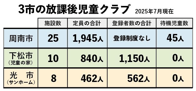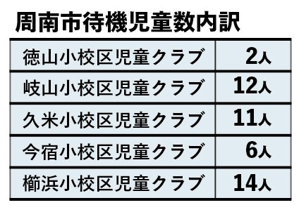 政治その他保護者が働いている家庭などの児童が放課後を過ごす児童クラブ。周南市では2025年度5月1日時点で、希望するのに利用できない「待機児童」が45人発生している。放課後の居場所を確保できなければ、保護者の就労などが困難になる。一方、下松市、光市では待機児童は発生させていない。