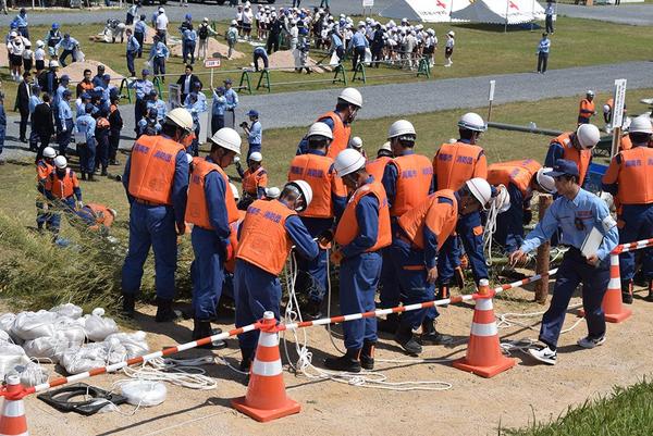 佐波川総合水防演習が25日、防府市の佐波川の河川敷で開かれ、国、県、市、民間団体などから1,200人が参加した。この日、就任したばかりの周南市の藤井律子市長も...