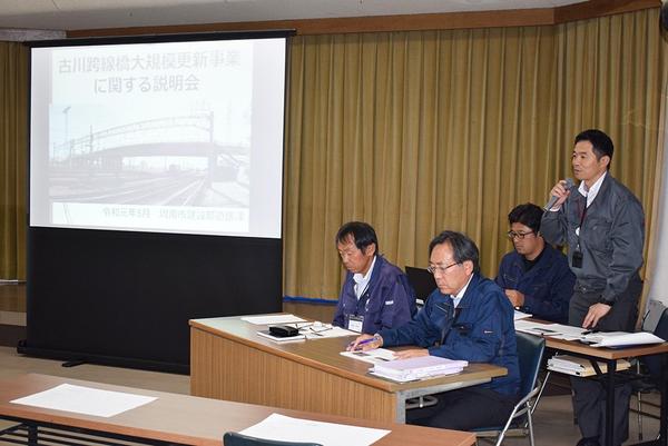 周南市のJR新南陽駅構内にある古川跨線橋の大規模更新事業の説明会が9日、徳山商工会議所で開かれ、市道路課の職員が今年度末に着工して完成まで10年かかることや、...