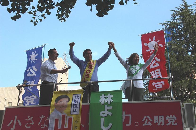 参院選比例代表の公明党現職、山本博司候補(64)の街頭演説会が6日、周南市の徳山駅前と、下松市のゆめタウン下松前に各500人が参加して開かれ、山本候補の3選へ...