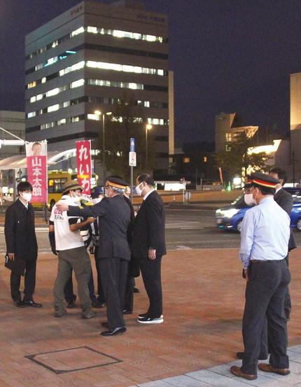 駅や市の職員、私服警察官に説得されるスタッフ(白いシャツ姿)