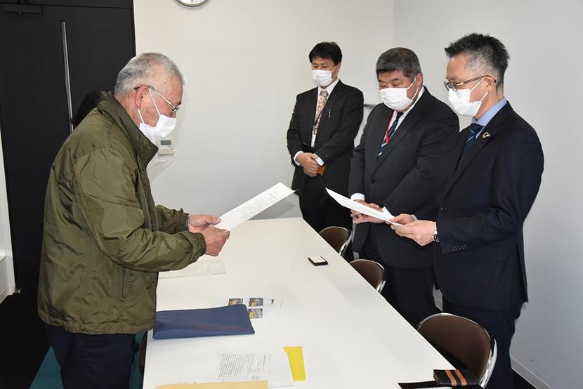申し入れ書を受け取る山本部長