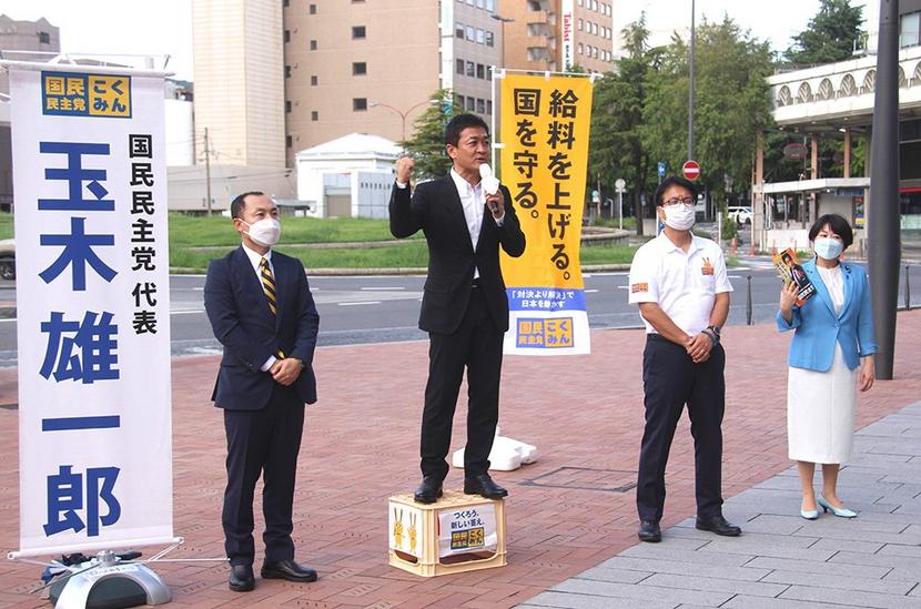 街頭に立つ左から大内氏、玉木代表、浜口議員、田村議員
