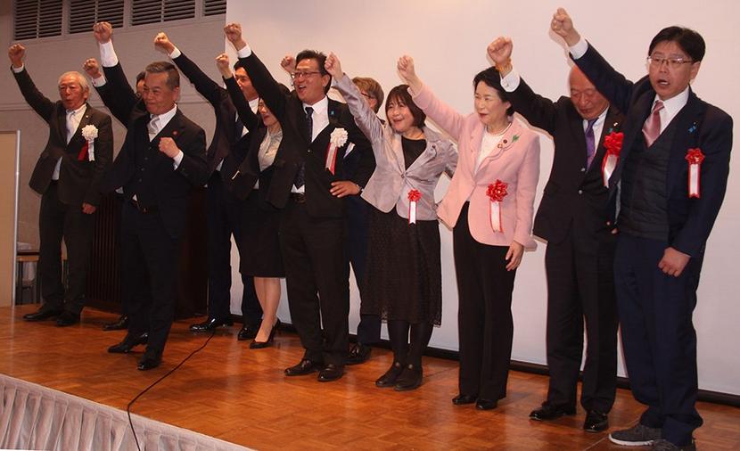 気勢を上げる坂本県議(右から5人目)
