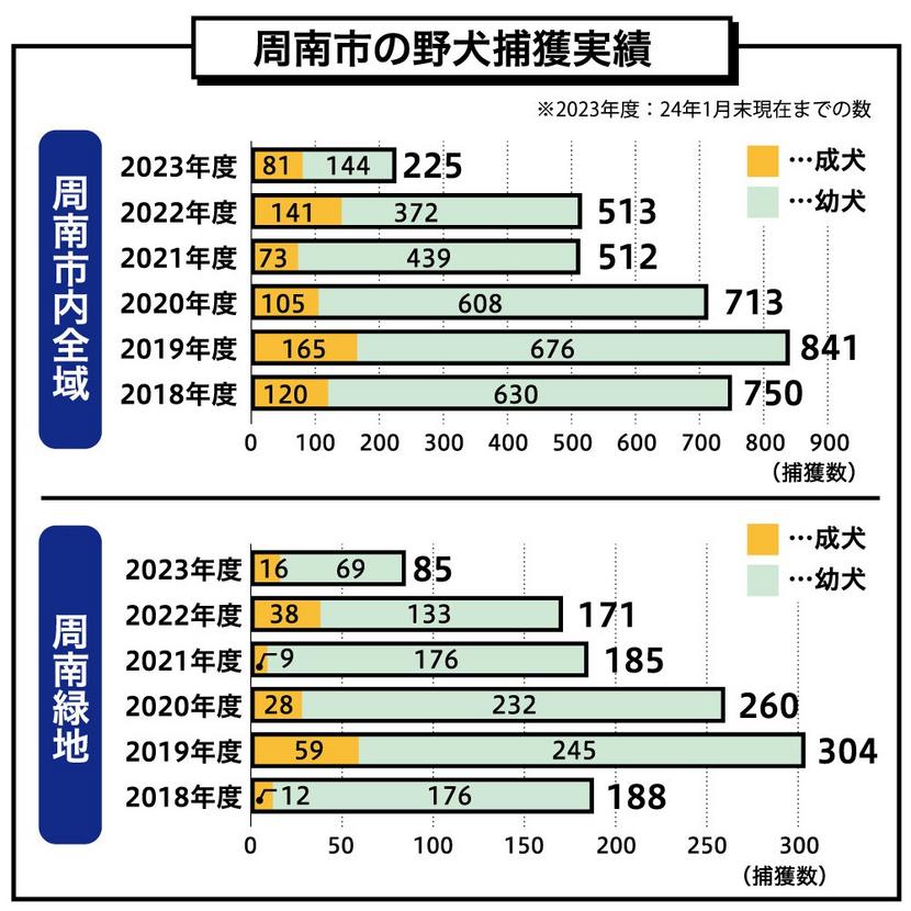 同市ではスポーツ施設がある周南緑地公園で野犬が増えて野犬の群が歩き回り、全国的な話題となった。このため、藤井律子市長の1期目の当選後、市は県と連携した野犬対策に力を入れ、野犬が増える要因となっている公園などでのむやみなえさやりを防ぐための監視や、野犬の捕獲に取り組んできた。