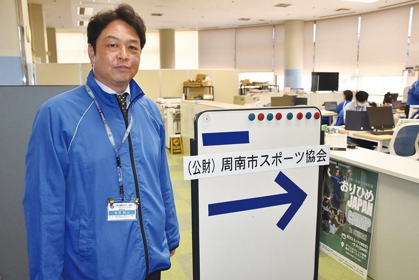 周南市スポーツ協会の表示と佐伯和人事務局長