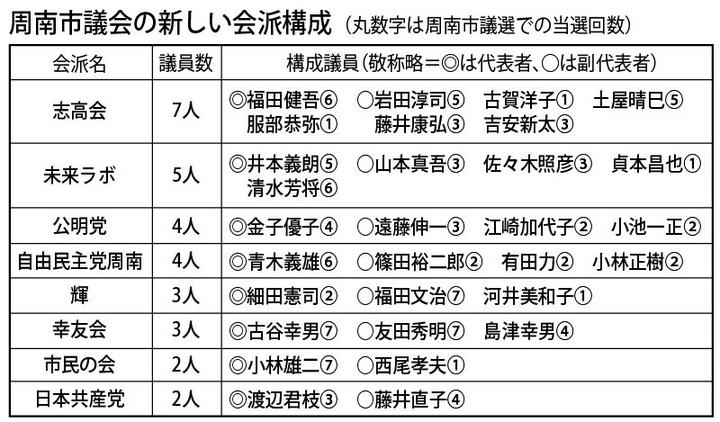 5月26日に投開票があった周南市議会(30人)の新会派の届け出が6日に締め切られた。改選前に7つだった会派は8つに増えた。最大会派は7人の志高会。未来ラボが5人、公明党と自由民主党周南が各4人、輝と幸友会が各3人、市民の会と日本共産党が各2人となった。