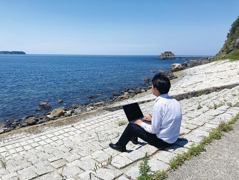 大津島ふれあいセンター近くの海岸でのワーケーション(提供=市観光振興課)
